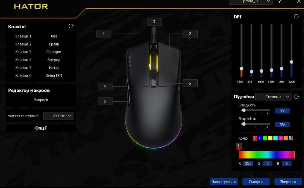 До налаштування клаві питань нема, просто і функціонально. Миша типу під “кіберспорт” зробили, тому є перемикання між режимами з різним DPI. Ну ок, тільки хто з вас використовує шість режимів DPI? Ну два, ну три. Чим більше режимів тим складніше взаємодія і перемикання між ними. А функція не вимикається, та ще й софт глюче іноді. Із зручного – кольори колеса миші для кожного режиму різні. Із не зручного – нелогічна схема або глючний софт. Налаштувати просто і так як вам треба буде складно. Як би це пояснити: ви змінили колір або яскравість підсвітки а в ва “зламався” показник DPI та колір підсвітки колеса мишки. Змінили частоту опитування – все інше перестало працювати так як раніше.