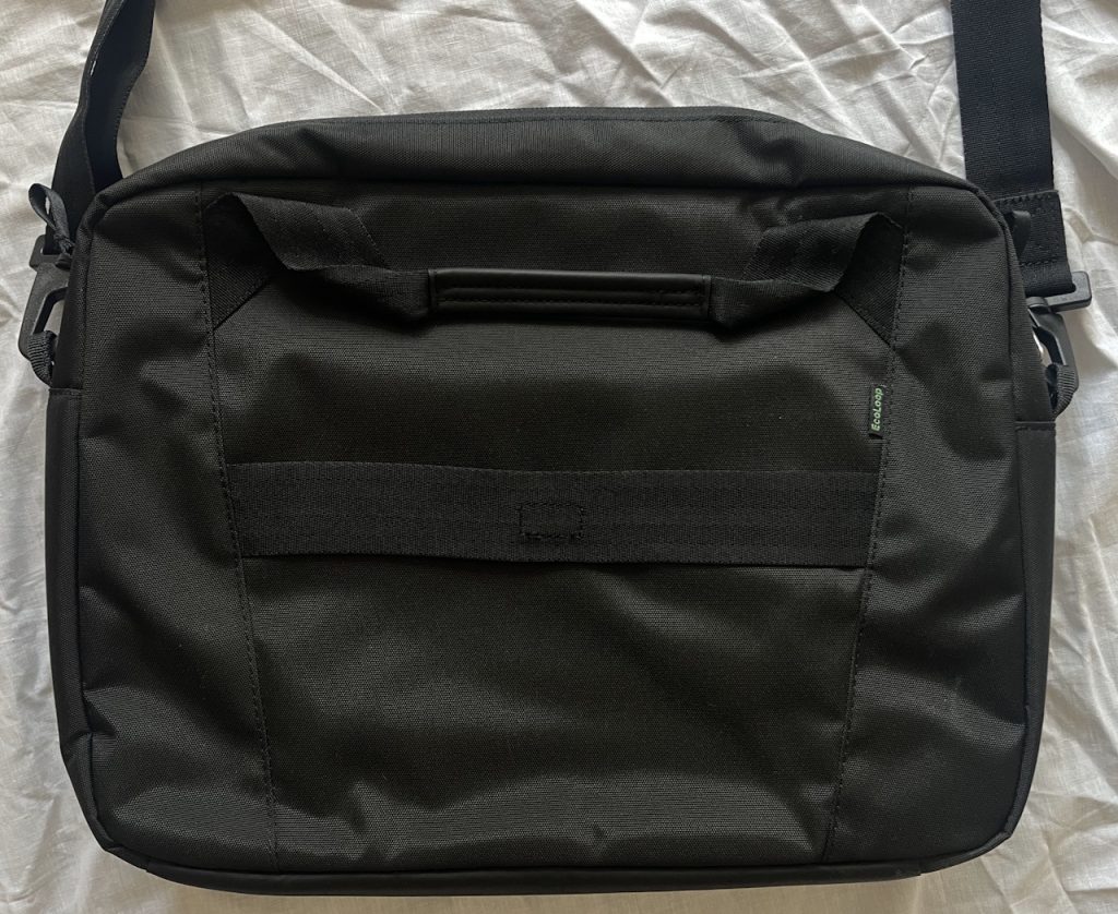 На фото в магазині сумка Dell EcoLoop Pro Slim Briefcase виглядає набагато презентабельніше, реальні фото трошки гірше (як я не старався, але фото ще псує ефект муару, насправді все не так погано). Звичайний поліестер з купою згадувань про екологію в описі сумки.