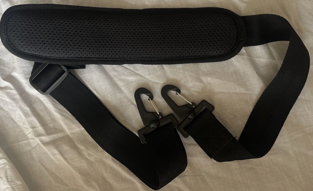 Ремінь для переноски дуже зручний. Когось можуть засмутити пластикові карабіни кріплення ременю, але вони досить міцьні і з якісного пластику. Накладка на плече досить доречна і зручна. Є ручки для переноски, теж досить ергономічні.